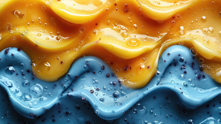 Dripping thick syrup creates vibrant textures against a blue background