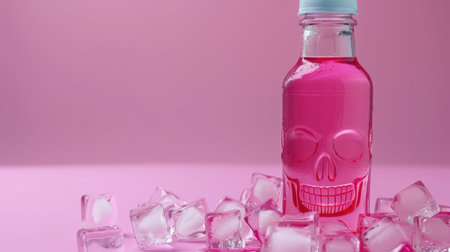 A striking image displaying a pink beverage in a skull-shaped bottle, complemented by ice cubes on a fashionable pink background, perfect for summer vibes.