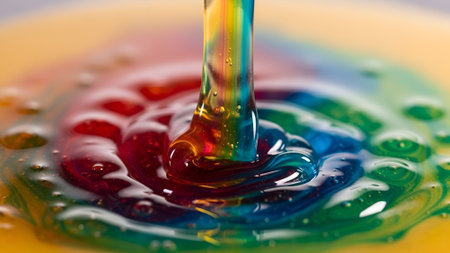 A close-up macro shot captures a single water droplet creating colorful, iridescent ripples on a liquid surface, with small bubbles forming around the edges. Clear details and vibrant colors enh...