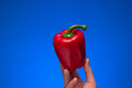 Single fresh red bell pepper held by Caucasian male hand. Close up studio shot, isolated on blue background.