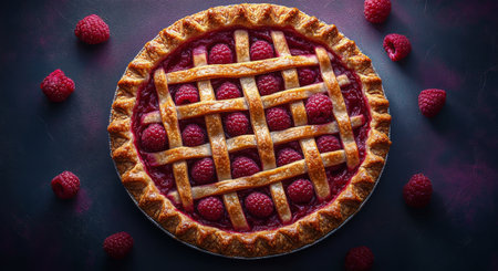 A freshly baked raspberry pie sits on a dark backdrop, showcasing its golden lattice crust