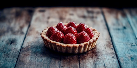 Delicious strawberry tart is presented beautifully on a rustic wooden table, perfect for summer gatherings, showcasing vibrant berries and a golden crust.