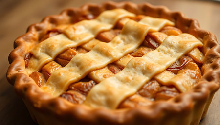 A close-up view of a freshly baked apple pie showcasing a golden crust, perfect for dessert lovers. Ideal for seasonal recipe showcases and culinary art.