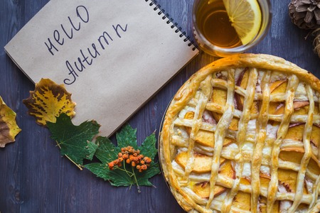 Autumn concept. Pie with Peaches Autumn Foliage Tea Honey On a wooden background Copy space Top view Flat lay