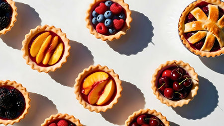 Top-down view of assorted mini fruit tarts with vibrant toppings—berries, peaches, and cherries—arranged on a white surface, casting crisp shadows in bright natural light.