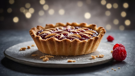 A delightful berry tart topped with fresh raspberries and blackberries, set against a soft pink background. Perfect for dessert lovers and special occasions.