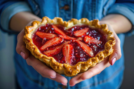 Person holding delicious strawberry pie with heart shape sweet treat for dessert lovers on a summer day