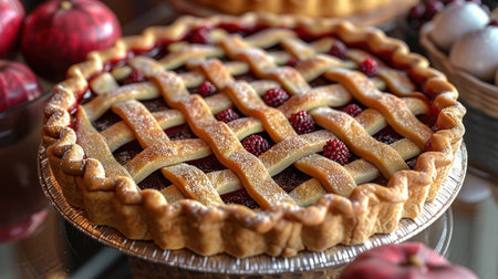 A beautifully crafted golden lattice apple pie, freshly baked to perfection. Perfect for celebrations, gatherings, or a cozy dessert at home. Enjoy!