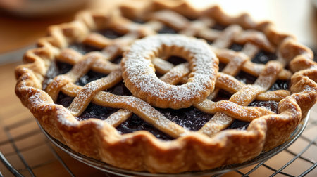 Close up of a golden-brown pie, featuring intricate crust details and a powdered sugar math symbol that adds a creative touch to the kitchen setting.