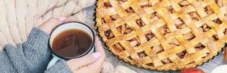 Girl with a cup of tea and a pie with apples and cinnamon. Selective focus. food.