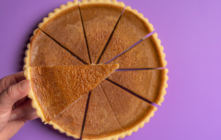 Woman holding a piece of pumpkin pie, above the whole pie, on a purple background. Minimalist image. Flat lay. Homemade pie. Holiday dessert.