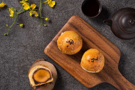 Top view of Moon cake yolk pastry, mooncake for Mid-Autumn Festival holiday on dark gray table background
