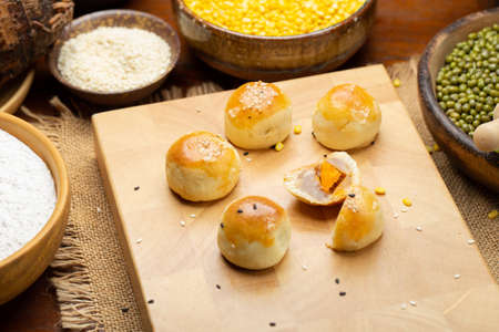 Moon cake yolk pastry, mooncake for Mid-Autumn Festival holiday, top view design concept on bright wooden table with copy space