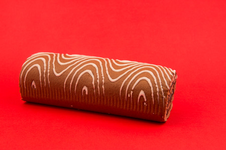 Christmas chocolate Swiss roll cake isolated on red background