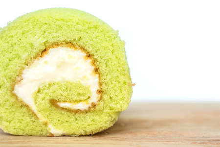 green cake roll on wooden table on white background.