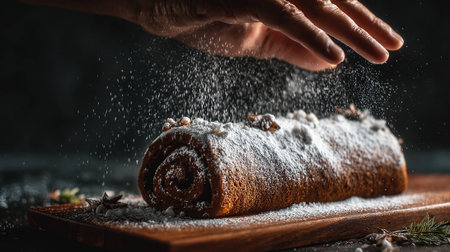 A hand sprinkling powdered sugar on a delicious chocolate cake roll