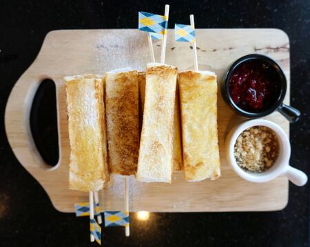 Toast stick with icing on top and serving with maple syrup sauce