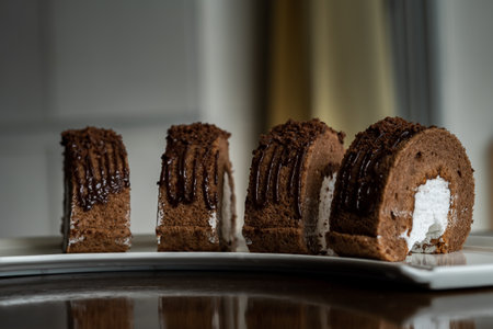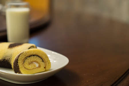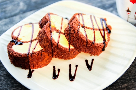 Close up beautiful chocolate Yam Roll in white plate