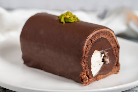 Chocolate roll with fresh cream on a white plate and wooden background