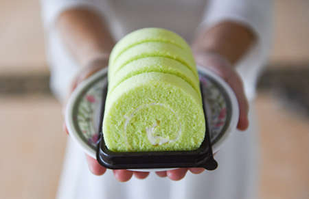 cake roll on plate / woman served green cake roll pandan with cream