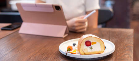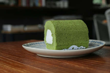 Green tea roll, green tea matcha dessert, Japanese sweet wth soft bread and sweet creamy on plate in coffee shop.