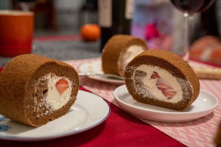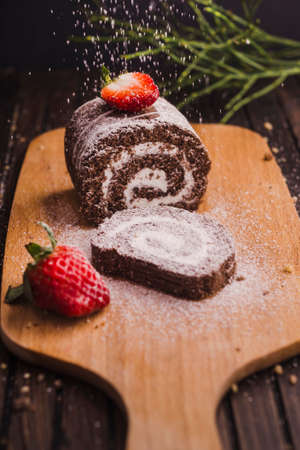 Sponge cake roll with chocolate and strawberry