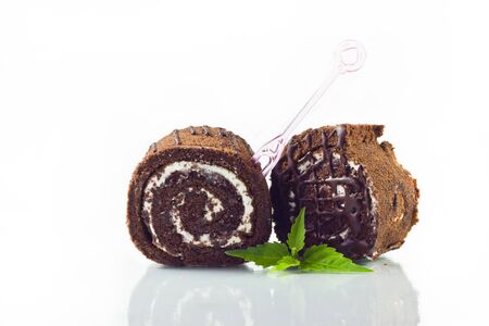 Chocolate cake-roll on a white background