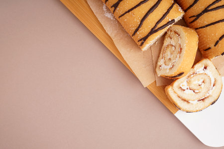 Wooden board with delicious sponge cake rolls on color background