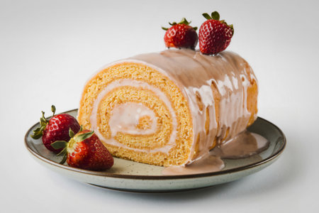 Sweet dessert roll with strawberries and cream on a plate