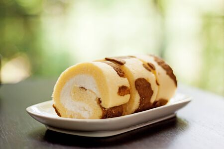 Cream roll cake sweet slices in white plate, delicious dessert isolated on wooden background closeup.