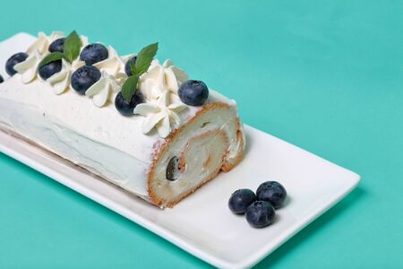 Sponge cake coated with cream and garnished with dried blueberries and fresh mint leaves. Against the background of mint color.