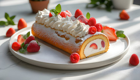 Strawberry roll cake with cream and fresh berries on white plate