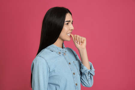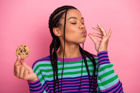 Attractive young woman enjoying a chocolate chip cookie against a vibrant pink background showcasing happiness and style