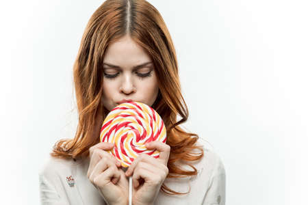 attractive woman with multicolored round lollipop in hands sweets emotions
