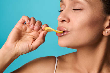 Headshot of a beautiful woman with healthy clean fresh glowing skin eating slice of lemon, posing with her eyes closed against bright blue colored background. Skin, body, health care concept. Close-up
