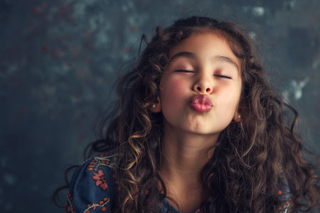 A young girl with long hair is kissing her own lips. The girl is wearing a blue dress and has a pink lip gloss on. Concept of innocence and fun, as the girl is engaging in a simple