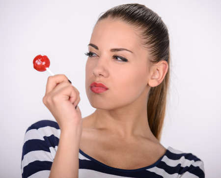 Sexy young woman holding candy. Redhair girl eating sweet lollipop on pink. Studio shot. Sweets.