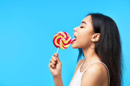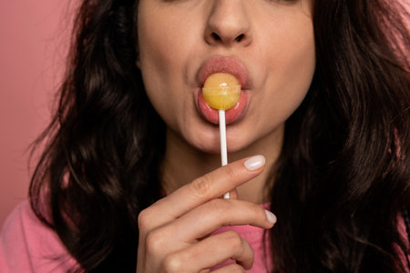Dark-haired woman with a sensual mouth licking a delicious hardy candy in front of the camera on the pink background. Love of sweet food concept