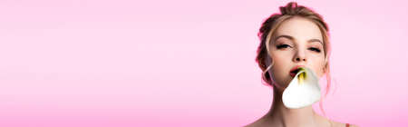 beautiful blonde woman holding calla flower in mouth isolated on pink, panoramic shot