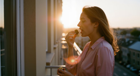Woman eating delicious chocolate cookie on balcony at sunset for World Chocolate Day. Sweet snack moment with beautiful natural light.