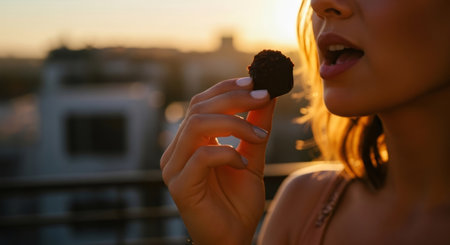 Woman enjoying dark chocolate praline on a city rooftop at sunset. Happy celebration on a summer evening terrace for sweet indulgence.