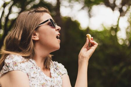 Happy young woman eating garlic clove outdoors - Portrait of cute girl wearing sunglasses having healthy vegetables as snack - Pretty female promoting vegan diet