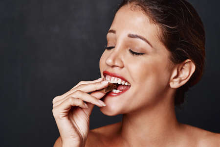 One bite can make your entire day. Studio shot of an attractive young woman biting into a piece of chocolate.