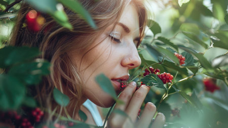 A woman enjoying the taste of ripe red raspberries while picking them in a lush green garden. Close-up of a woman savoring the fresh taste of ripe berries, amidst a verdant backdrop. AIG50