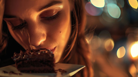A woman is smiling as she smells a piece of chocolate cake on a plate. The dessert is a delicious baked good, perfect for a birthday celebration AIG50