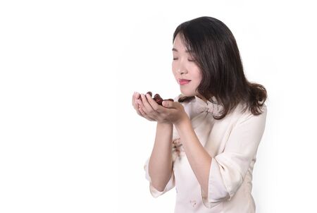 Young woman holding a coffee beans. Woman sniffs coffee beans.