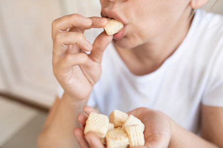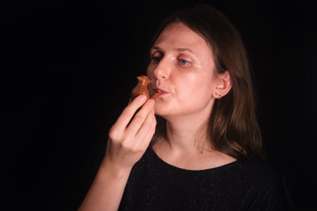 Portrait of a woman with closed eyes eating a chocolate bar and enjoying