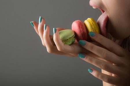 female hands with soft tender skin and blue manicure holding and licking colorful french biscuits of macaron or macaroon green yellow and pink color near sexy lips on grey background