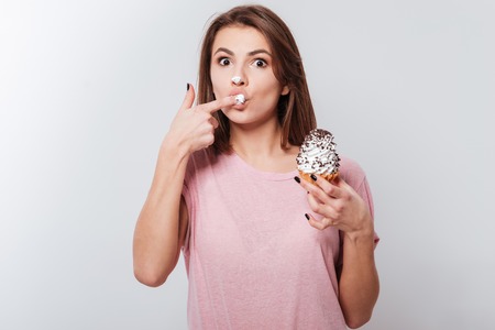 young beautiful blonde with long hair holding a cupcake in her hand, enjoying with her eyes closed. on grey background