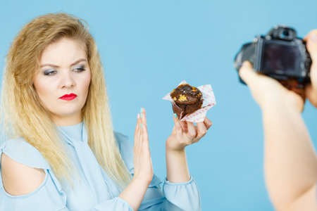 Woman refuses to eat chocolate cupcake, man taking picture of her. Blue background.